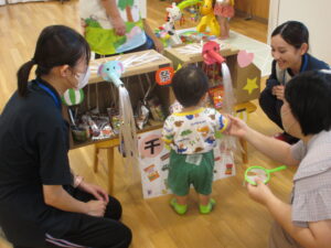 令和7年9月17日(水)に子育てサロンを行い、お祭りをしました。係職員は8月からお祭りに向けて、制作を行い、水風船すくい、わなげ、千本引き、わたあめの可愛い屋台を作り、若葉学園から提灯をお借りして、より一層お祭りの雰囲気を作ることができました。当日は4組の親子が参加して下さり、浴衣や甚平を着て来る子もいて、とても可愛かったです。どの屋台でもとても楽しそうに遊んでくれたので、とても嬉しかったです。おもちゃのスペースでもたくさん遊んでくれて、お母さんたちも会話が弾んでいて、ゆっくりしながらお母さん同士の交流もできて良かったです。次回は11月19日に秋の食材を使った親子クッキングとどんぐり山で秋探検を行います。ぜひ遊びに来てください!